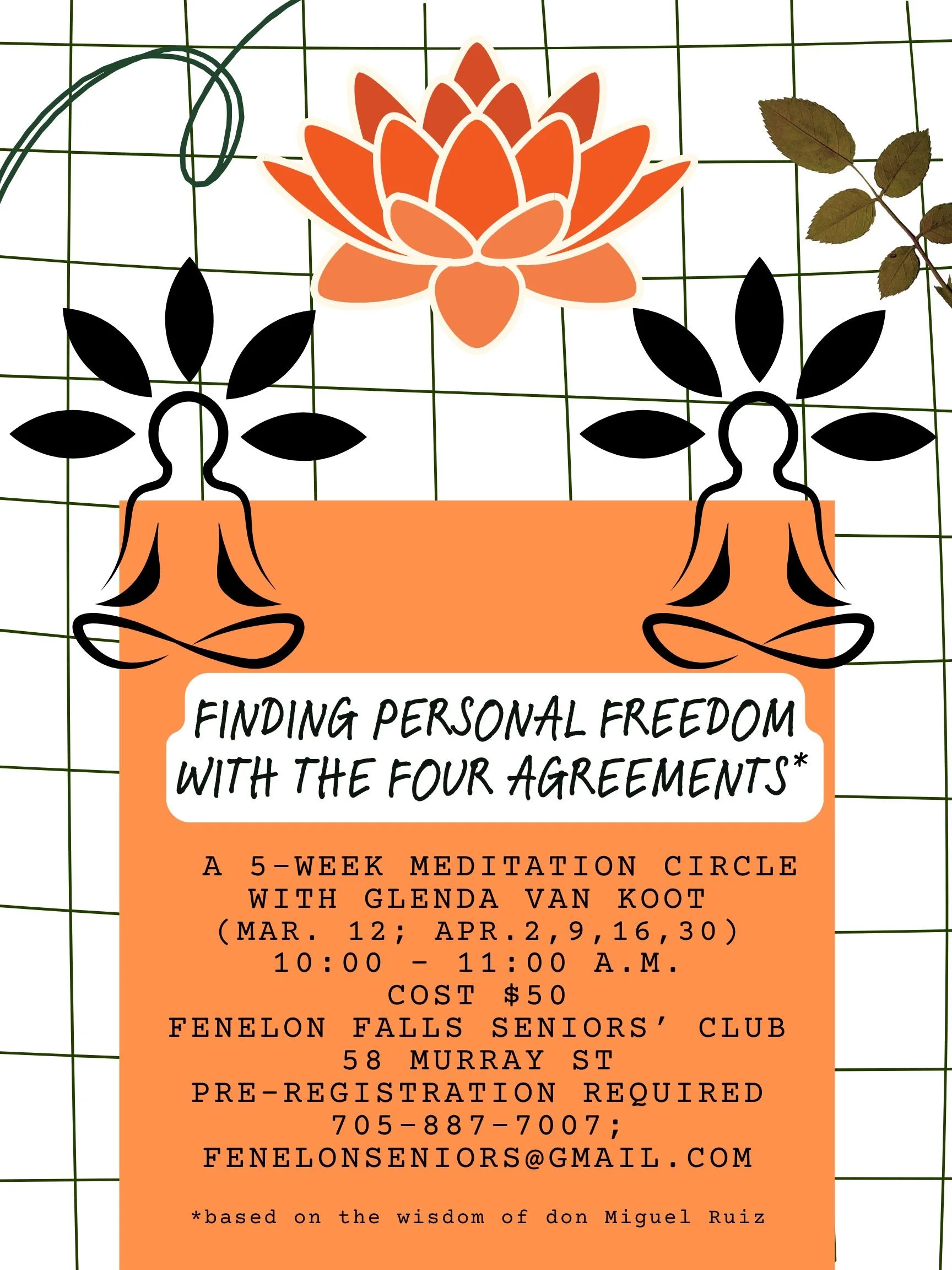 Join in on the popular meditation learning series facilitated by Glenda van Koot. Registration is now open for a new 5-week meditation circle, Finding Personal Freedom With The Four Agreements, based on the wisdom of don Miguel Ruiz on Thursday. morning from 10:00-11:00 on the following dates March 12, April 2, 9, 16 & 30. The cost is $50 and pre-registration is required. There is a minimum of 10 participants needed.